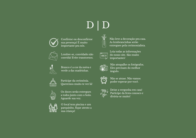 O nosso grande dia será celebrado ao ar livre, começando à tarde e se estendendo até a noite. Pedimos que os convidados usem trajes leves e elegantes.